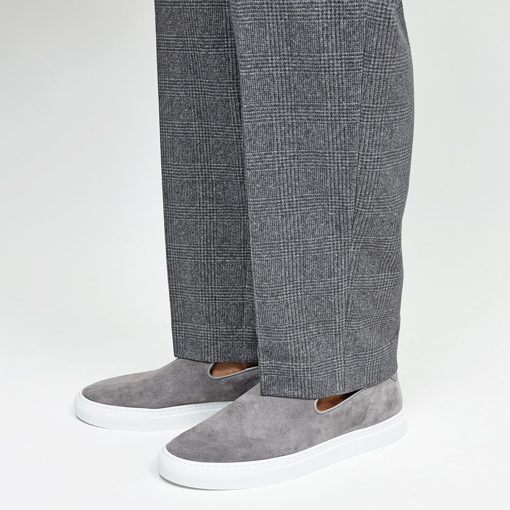 グレーのスエードは足元をほどよく軽快に見せてくれるので、重ためのモノトーンスタイルに合わせることで、バランス感を保ってくれる効果があります。