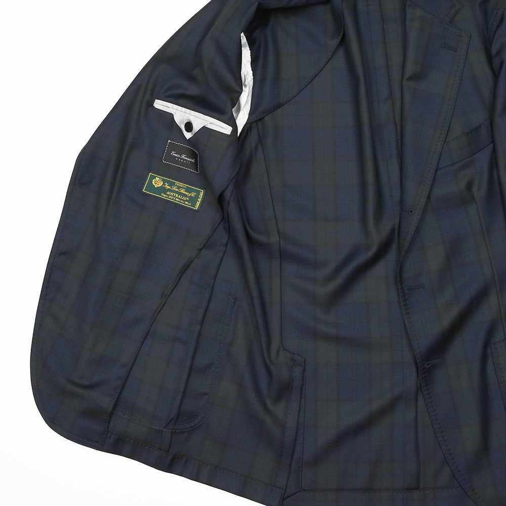 LoroPianaの“AUSTRALIS”を使用したこちらは、目付け270gの真夏以外で着用できるブラックウォッチジャケット。