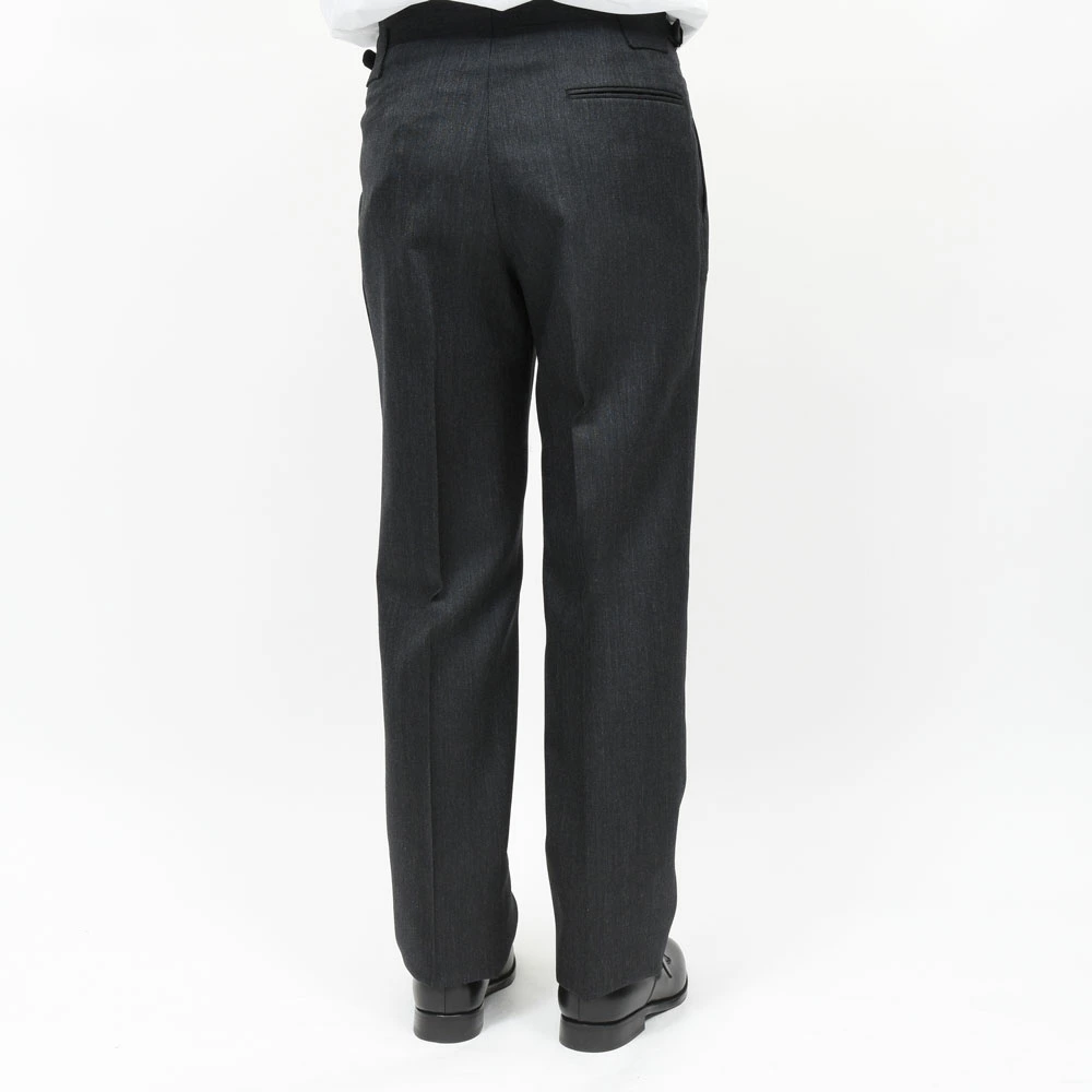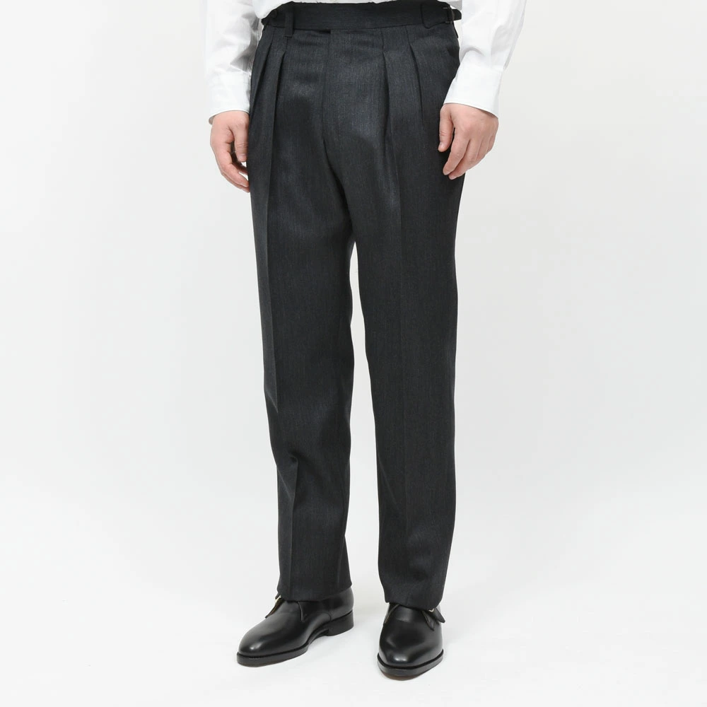 ヒップの収まりは非常に良く、プリーツの開き方や落ち方も実に自然でして、穿いた瞬間に感じる安心感は、やはりビスポークの思想を持つ作り手ならではのものです。