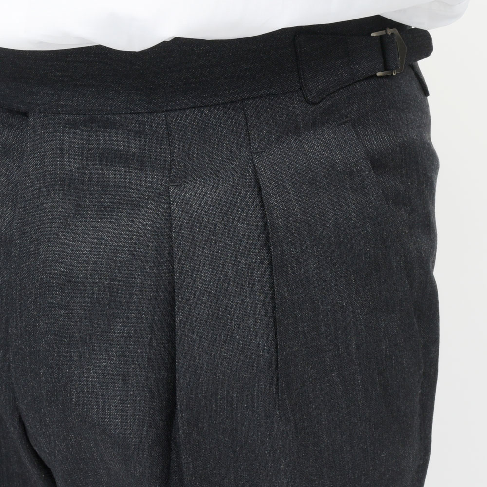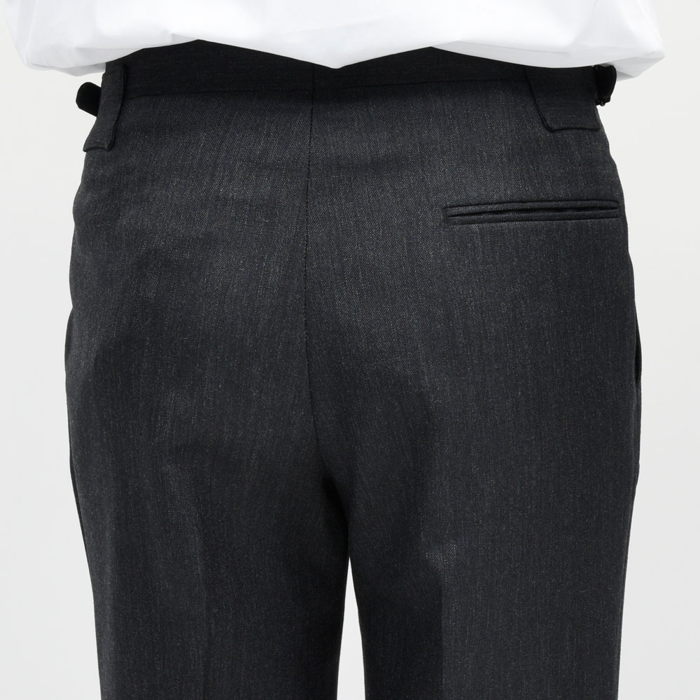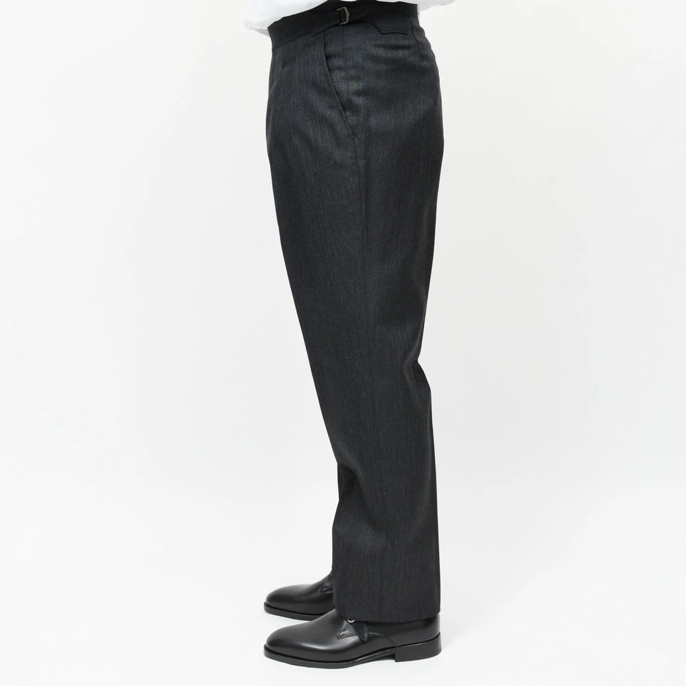 サイドアジャスター仕様にすることで、ウエスト周りも非常にすっきりとした印象で、ジャケットスタイルとの相性はもちろん抜群な上にカジュアルなスタイルとも合わせていただける、まさに大人のトラウザーズと呼ぶにふさわしい一本だと思います。