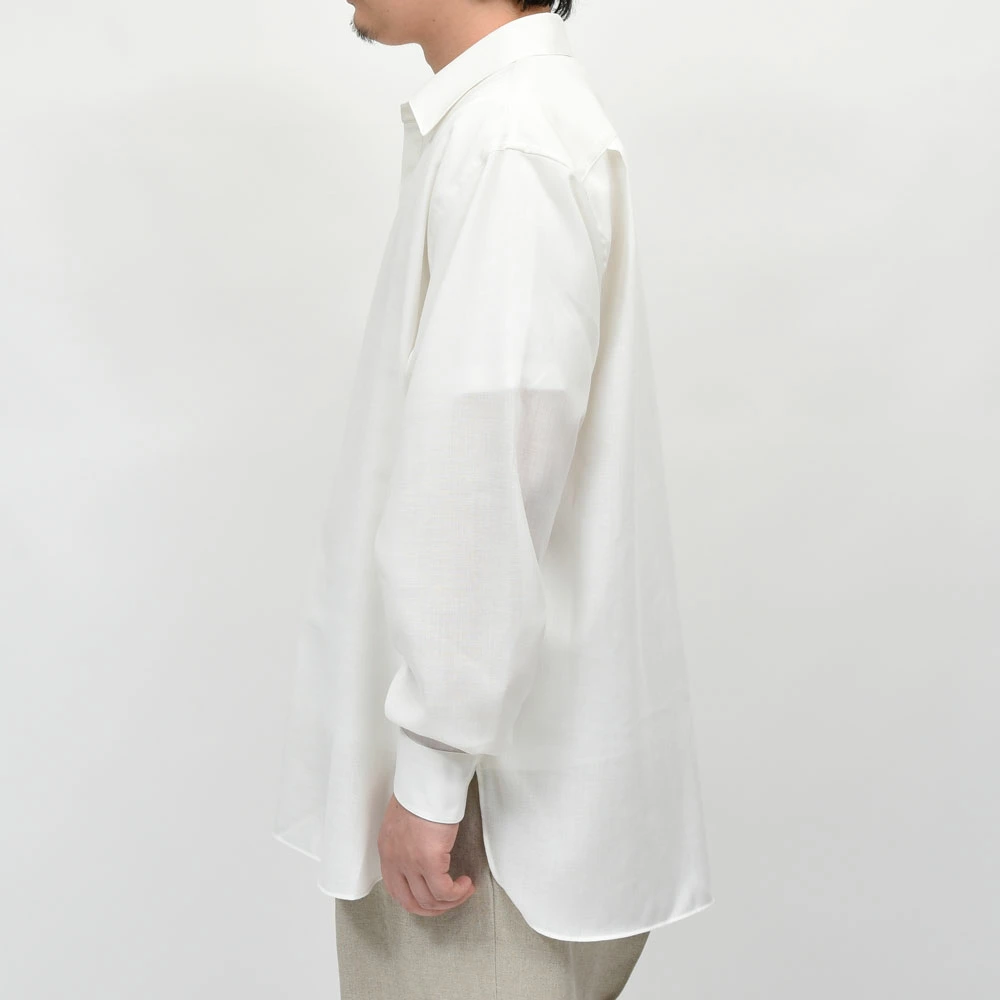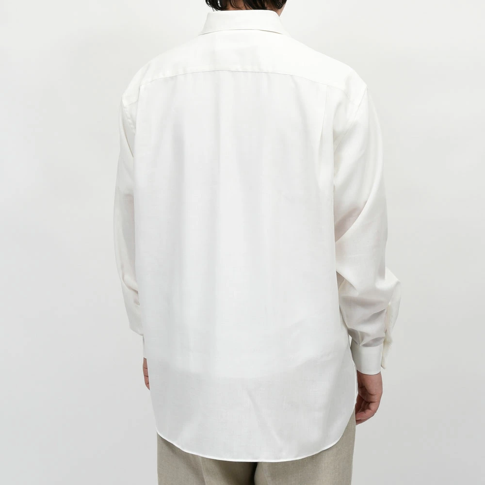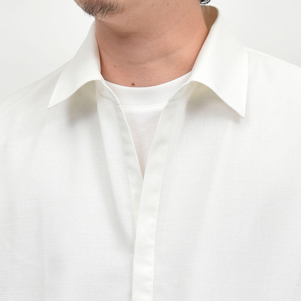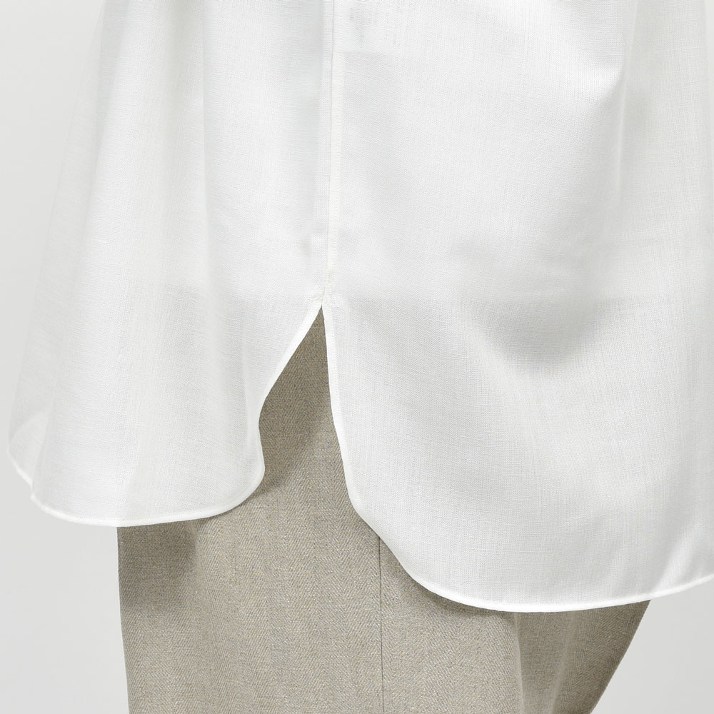 ボディはバストに対してウエストを細めに設計することで、ゆとりがありながらもすっきりと見えるシルエットにで、襟はイタリアのシャツに見られるような柔らかなフラシ襟で、台襟なしのワンピース仕様にすることで、より自然でリラックスした首元を演出しています。