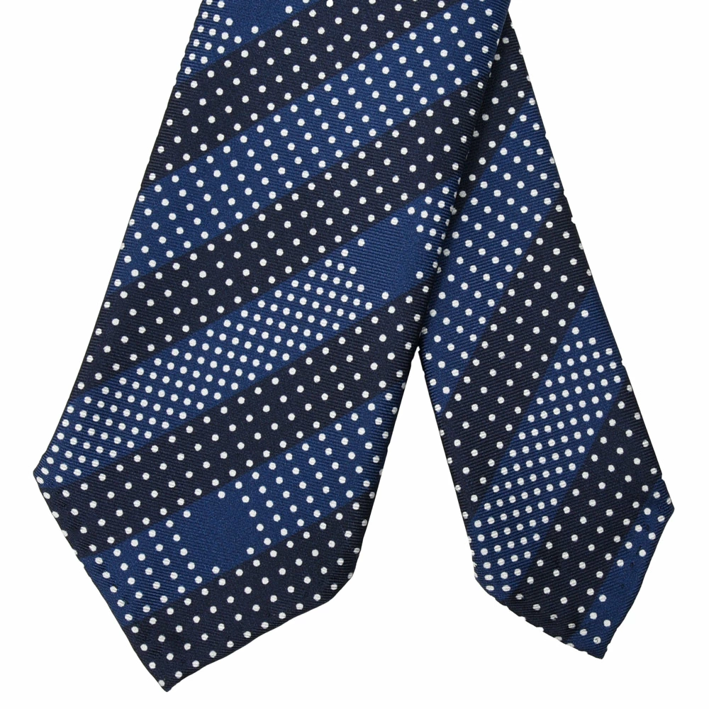 ストライプ柄というと、通常は線で表現されることが多いのですが、このネクタイではポルカドットのランダムな配置によってストライプを形成。