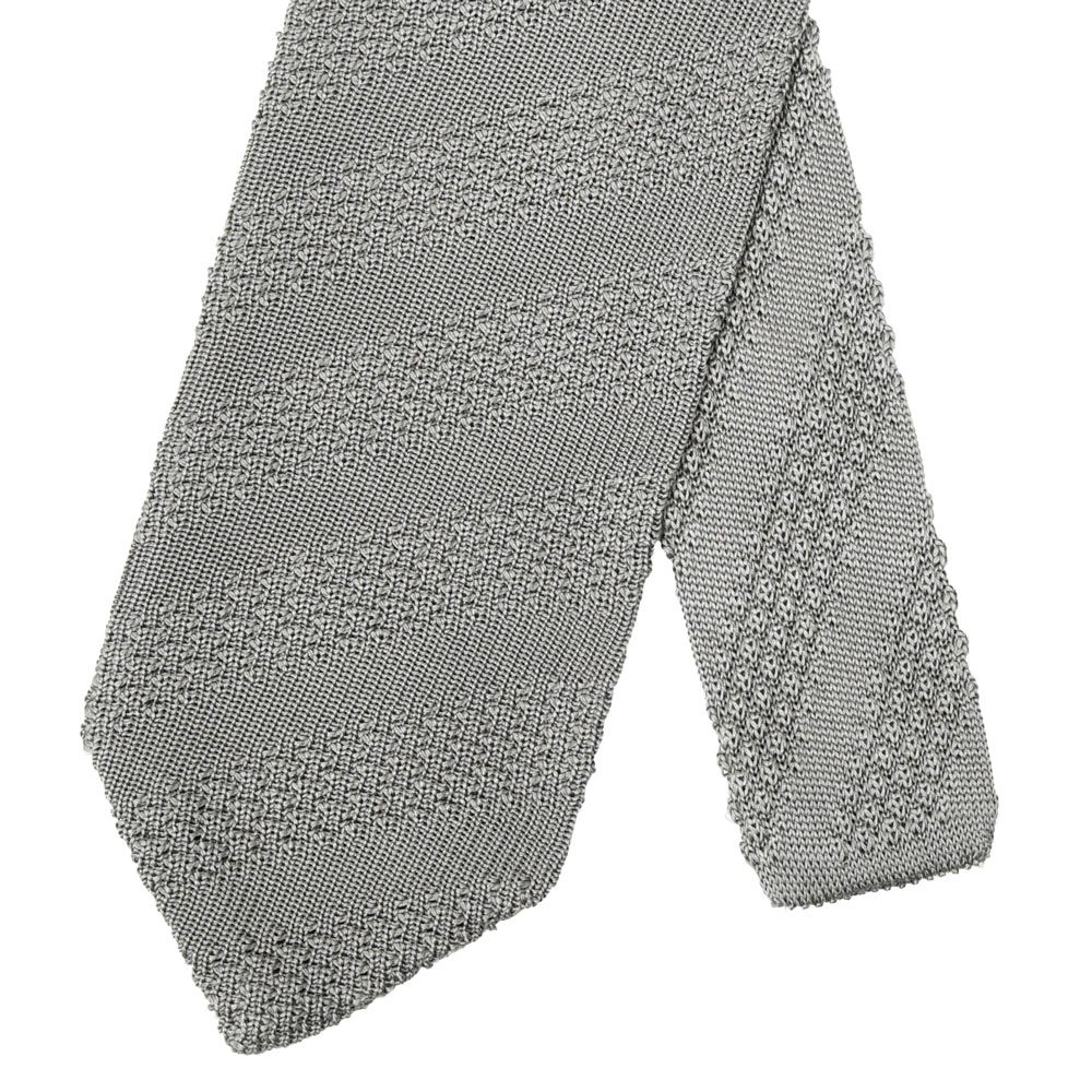 一般的なニットタイはボリュームのある太番手の糸を使用することが多く、やや重厚感のある表情になるものが主流ですが、今回採用しているのは非常に細い糸でして、これにより編み目がコンパクトになり、すっきりとした軽快な印象に仕上がっています。