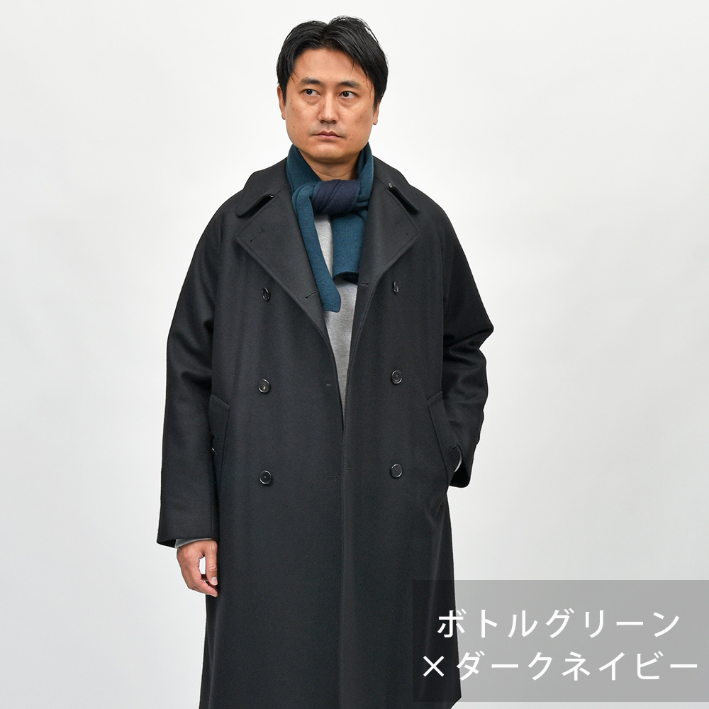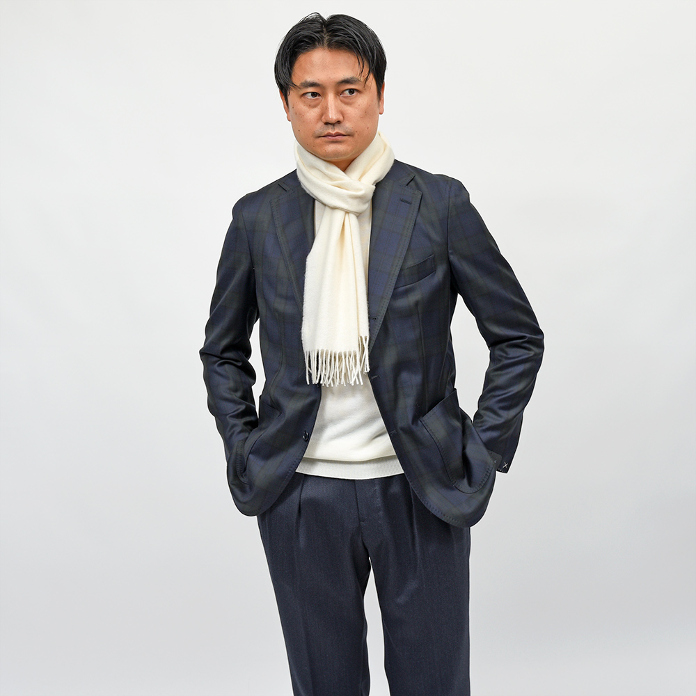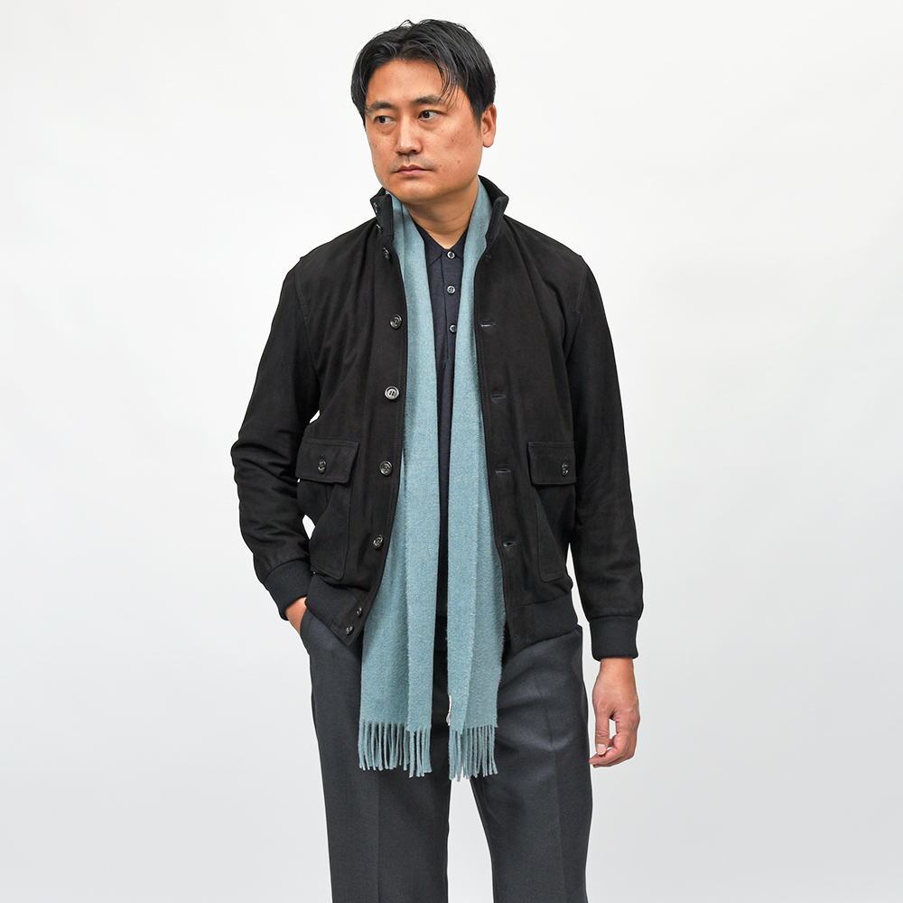 もちろん、オンからオフにと幅広くお使いいただける点も素晴らしいのですが、コートの下ではなく上から巻いて使うなんてことも是非おすすめしたいですね!