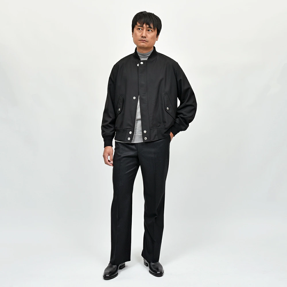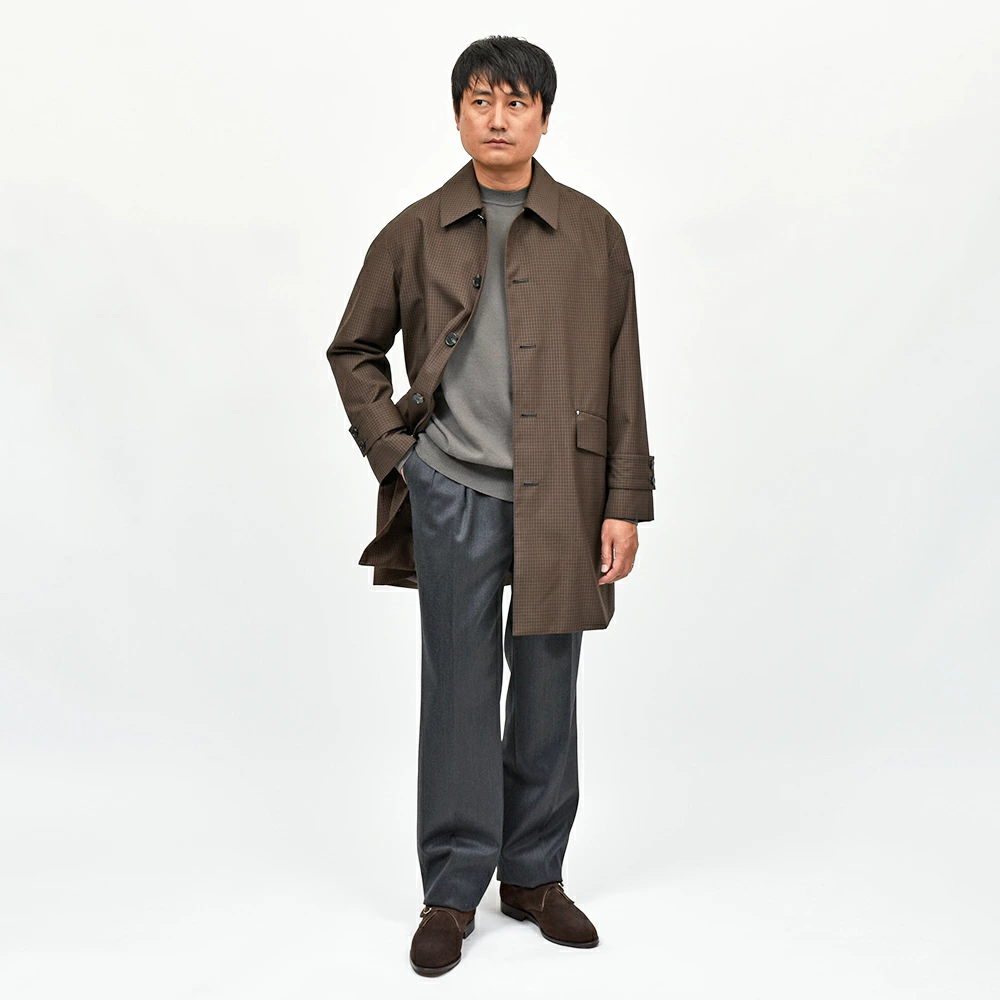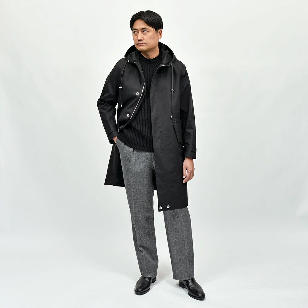 高密度に織り上げたウールポプリンは、見た目の上品さと撥水という機能性も持ち合わせた頼もしいやつです。